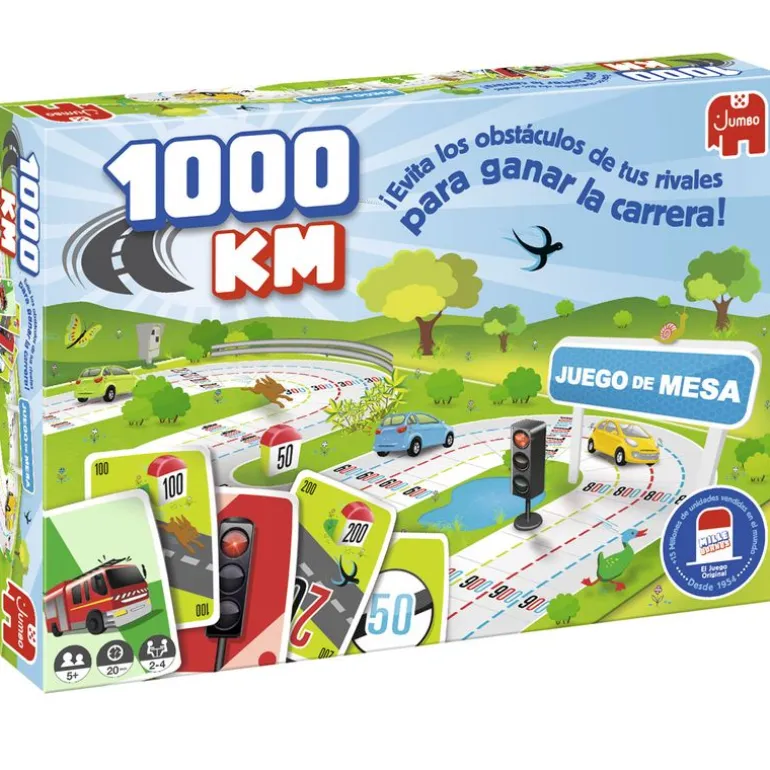 1000 KM es un juego de mesa en que el objetivo principal es llegar a la meta de los 1000 KM ¡Tendrás que prestar atención a tus oponentes! Podrías quedarte sin combustible, pinchar una rueda o tener un cliente… ¡Saltarte un semáforo rojo te retrasará! Recoge las cartas para defenderte o incluso volverte invencible hasta la línea de meta. En el interior encontrarás todos los accesorios para jugar. Contiene 110 cartas, un dispensador de cartas, un tableo, 4 peones de coche, 17 peones de ataque, 4 piezas de protección y las instrucciones de juego. De 2 a 4 jugadores. Recomendado a partir de 5 años.