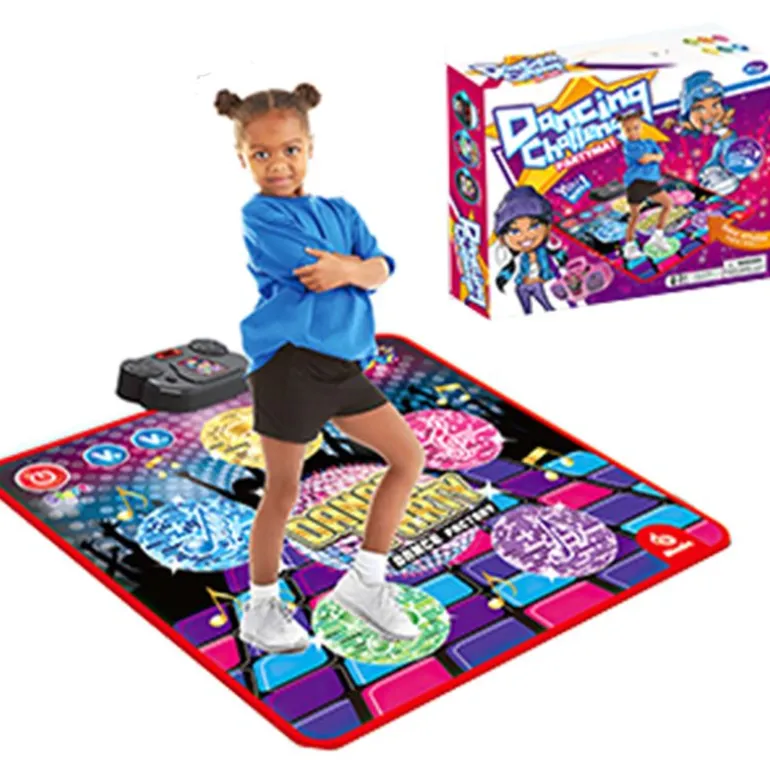 La alfombra es tactil y responde a la presión. Se encienden sus luces al ritmo de la canción para ir pisándolas y sumar puntos. Tiene una pantalla led donde salen los puntos y las canciones están incluidas.