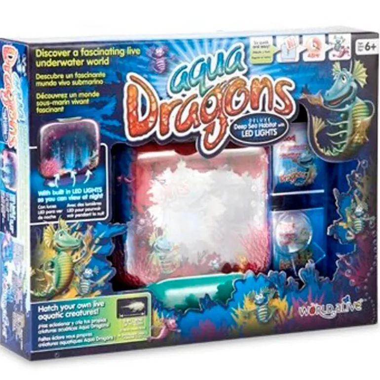Pack con el que podrás hacer crecer tus propios aqua dragons. En el interior encontrarás la pecera, huevos, comida, una cuchara, una pipeta, lupa y las instrucciones de uso. Dispone de luz LED para que puedas ver tus nuevas mascotas. Recomendado a partir de 6 años.
