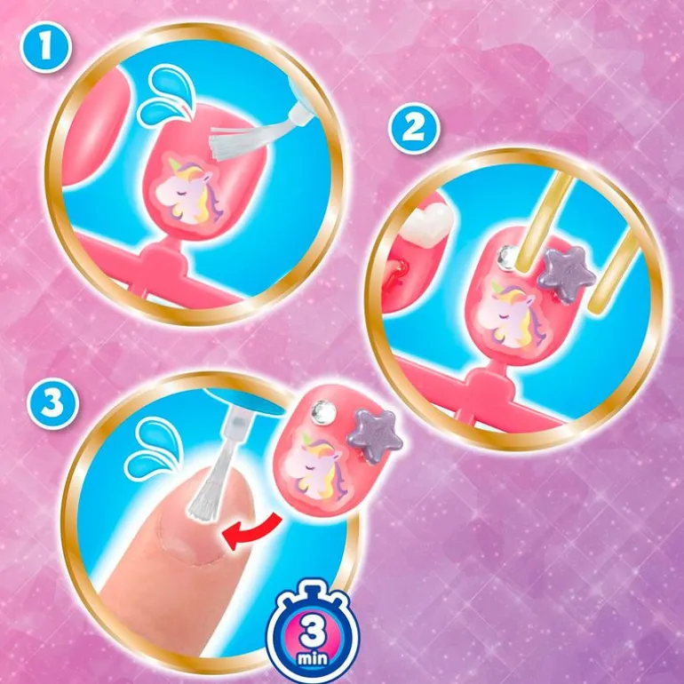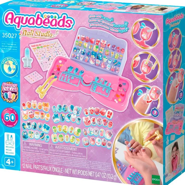 En el interior encontrarás 60 uñas Aquabeads con decoraciones en 12 colores, mesa de trabajo, pinzas de plástico, aplicador de agua con cepillo, calcomanías, soporte de exhibición, hoja de diseño e instrucciones.