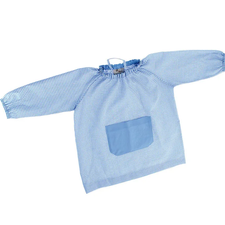 Estampada en cuadros vichy azul con un bolsillo a contraste en azul liso. Incluye una tira interior en el cuello para colgar.