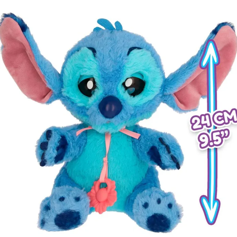 Adorable Stitch de la colección Baby Paws ¡Abre sus ojitos! Si le quitas le chupete se despertará abriendo sus ojitos y si se lo quitas los cerrará quedándose dormidito.