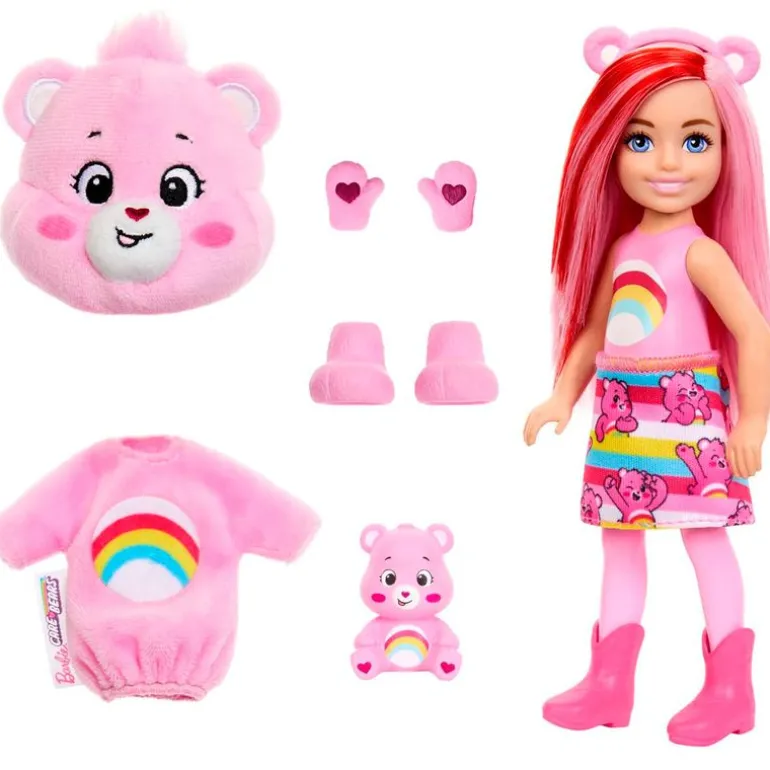 Abre la caja para descubrir un adorable personaje de los Osos Amorosos, bajo ese traje encontrarás a Chelsea, la hermana pequeña de Barbie.