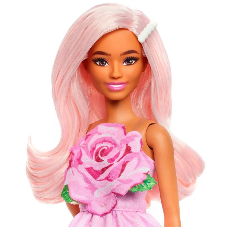 ¡Barbie tiene un cuerpo pequeño! Complementa su pelo rosa pastel con un pasador nacarado que muestra su estilo refinado.