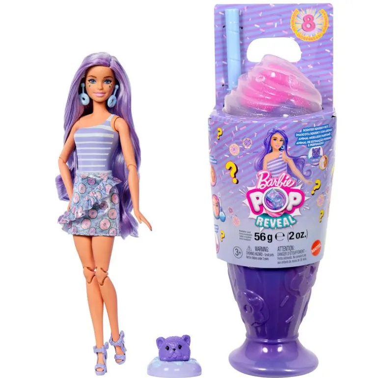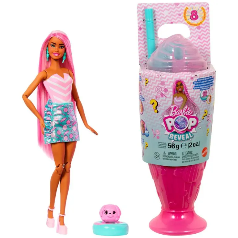 Cada conjunto incluye ocho sorpresas, de modo que las muñecas de la Colección Dulces de Barbie Pop Reveal ofrecen una experiencia sensorial de lo más divertida con temática de dulces al desempaquetarlas.
