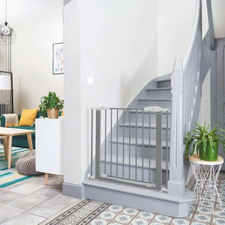 Barrera de seguridad que se abre y se cierra fácilmente en ambos sentidos y con una sola mano. Fácil de instalar gracias al sistema de fijación por presión. Fabricada en metal. Sistema de bloqueo para que los más pequeños de la casa no puedan abrir la puerta.