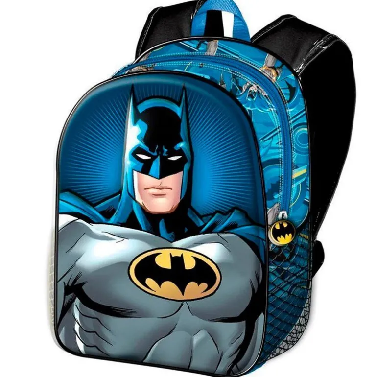 Mochila escolar con diseños del superhéroe Batman. Dispone de un compartimento para accesorios escolares y 2 bolsillos laterales de malla. Sus dimensiones son de 26 cm x 31 cm x 11 cm aproximadamente.