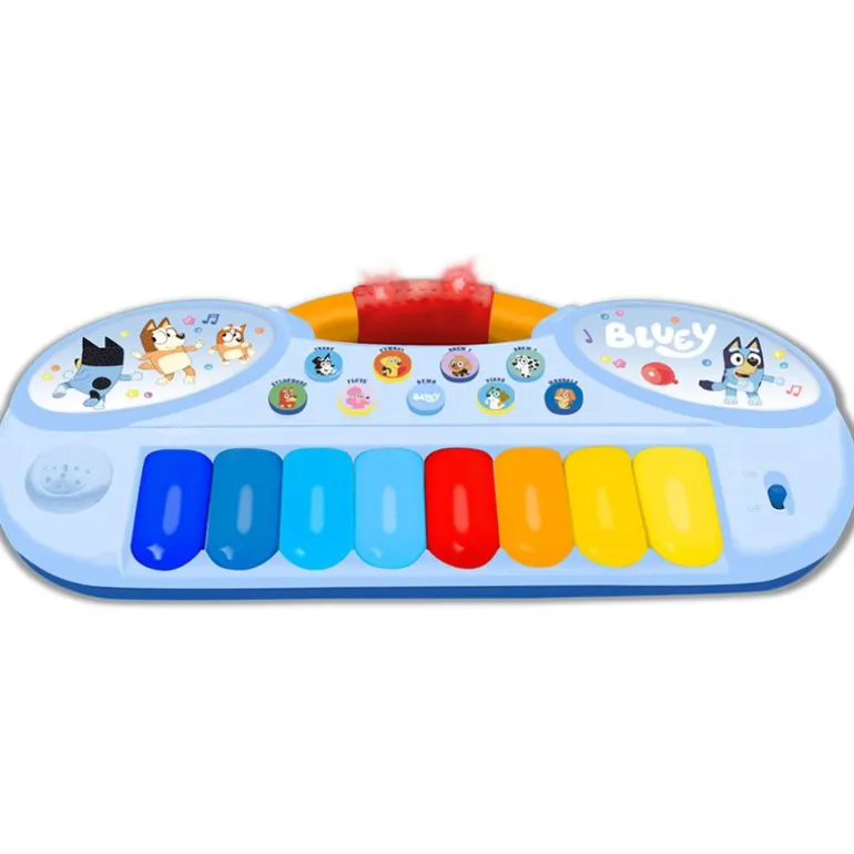 Piano infantil con diseños inspirados en la serie de animación Bluey. Dispone de 8 teclas y botones para reproducir sonidos. Recomendado a partir de 1 año.