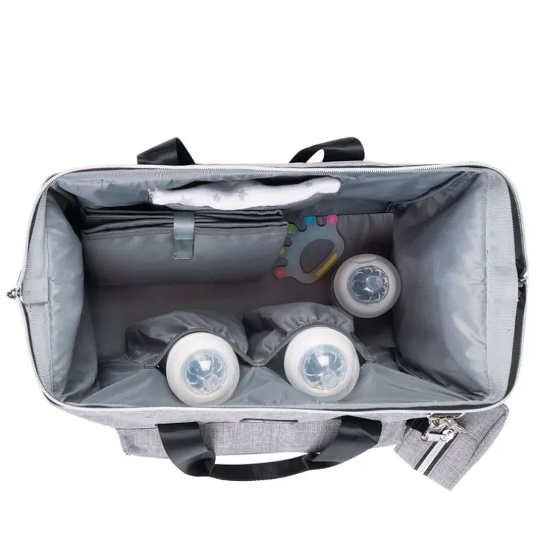 Es muy espaciosa, tiene capacidad para llevar los pañales y la ropa de muda del bebe, con 2 compartimentos para los biberones, el agua o la leche y un bolsillo externo grande.