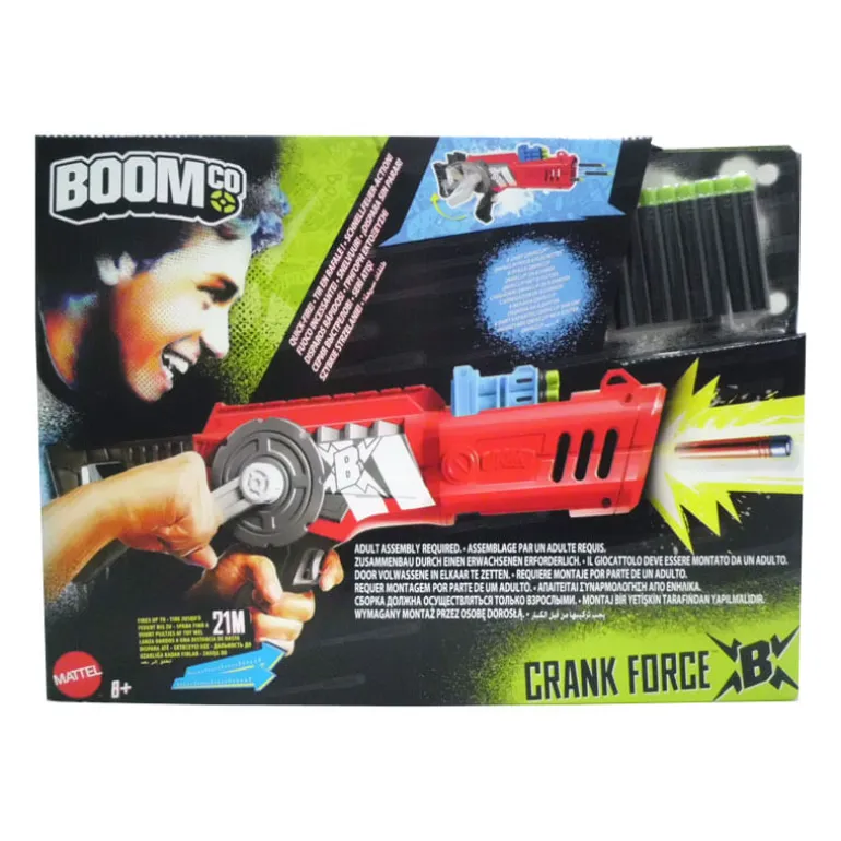 Nueva arma Boomco Crank Force más potente y rápida. Con sistema de manivela y función de velocidad máxima basada en el sistema QwikClip, los disparos pueden alcanzar una distancia de hasta 21 metros. Para disparar sólo has de mantener presionado el gatillo automático y hacer girar el mango tan rápido como puedas. El sistema QwikClip está especialmente diseñado para no atascarse durante el juego. Incluye 1 pistola, 1 clip de recarga y 8 balas.