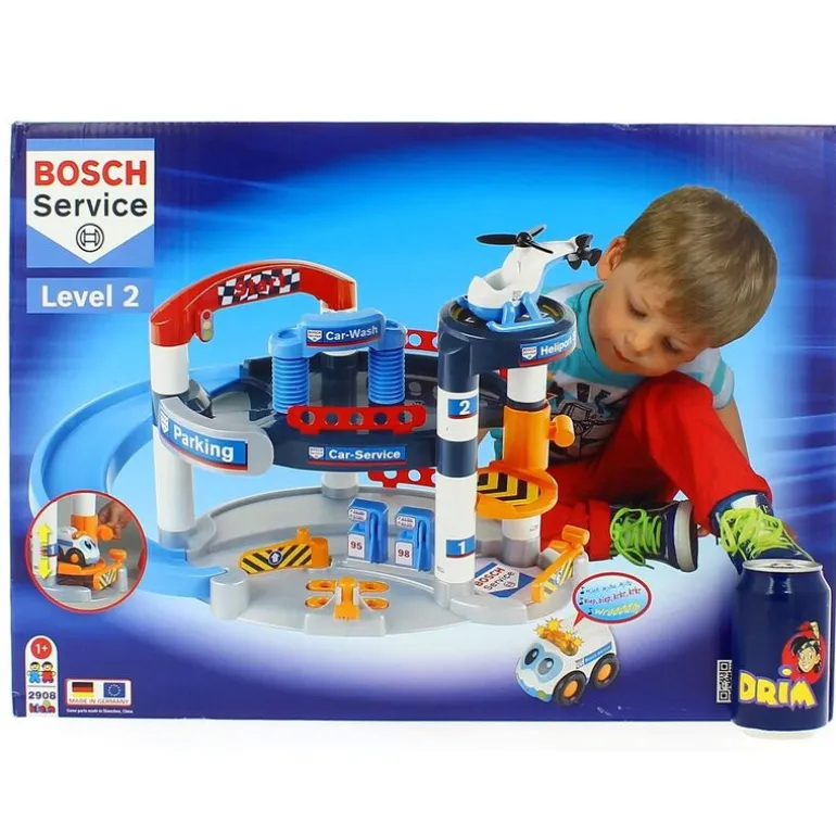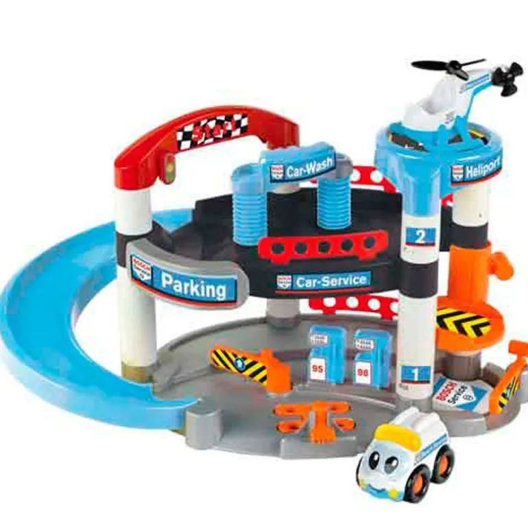 Divertido parking infantil inspirado en la famosa marca Bosch. Tiene 2 plantas y dispone de diferentes áreas de juego, el ascensor, el túnel de lavado de vehículos, la gasolinera, helipuerto y una plataforma de palanca retráctil. Reproduce sonidos y tiene luz. Incluye un vehículo y un helicóptero. Funciona con 3 pilas AA NO incluidas. Recomendado a partir de 1 año.