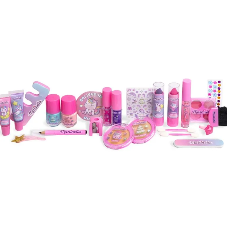 Contiene 2 brillos de labios, 2 barras de labios, 2 esmaltes de uñas, 2 labiales líquidos, 2 aplicadores, aceite de labios, paletas de sombras de ojos, resaltador, lápiz de ojos, separador de dedos, lima de uñas, cepillo de rubor, hoja de pegatinas para las uñas, hoja de pegatinas para las uñas 3D, sacapuntas, espejo, anillo y una pinza para el cabello.