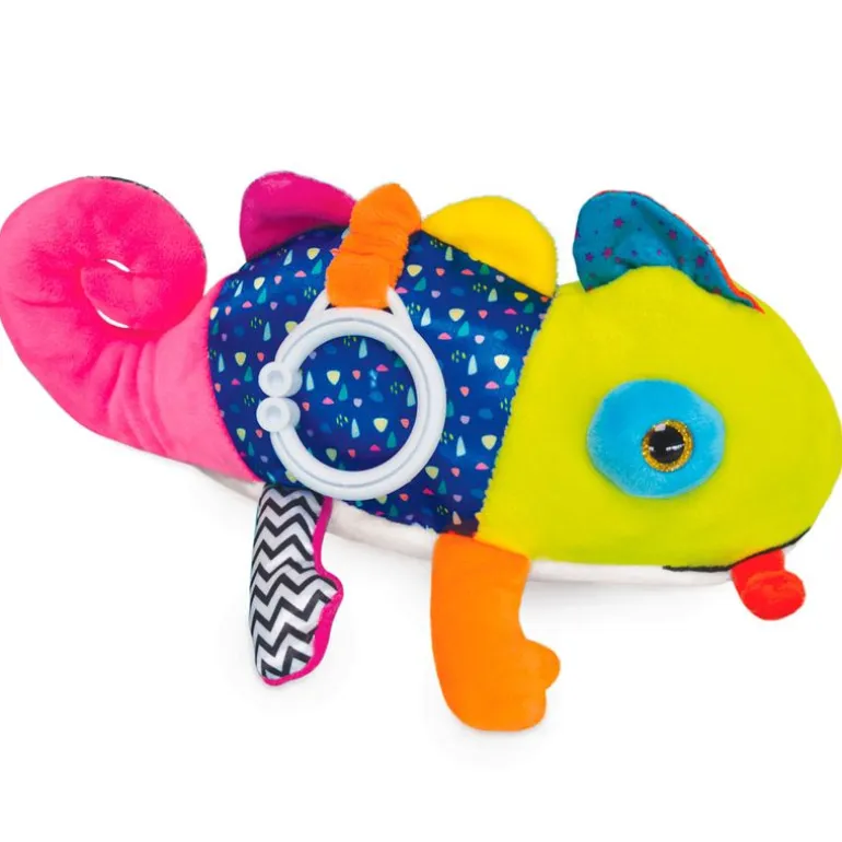 Camaleón para los más pequeños de la casa, fácil de manejar y con una anilla que permite colgarlo fácilmente en cualquier lugar. Dispone de anillos de colores, sonajero, espejo y tejido crujiente. Recomendado a partir de 0 meses.