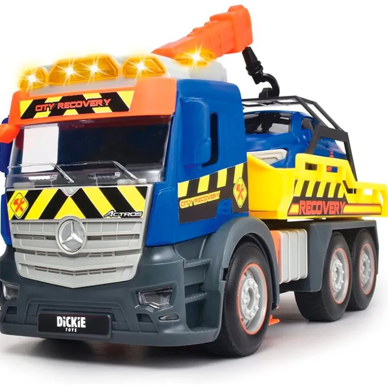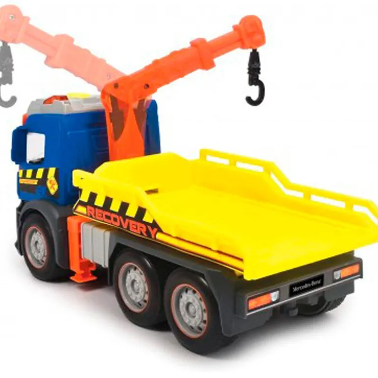Camión Grúa de la colección Mercedes con reproducción de luz y sonido. Funciona gracias a su mecanismo de fricción. Dispone de partes que podrás mover como si fuera un camión grúa de verdad. Incluye vehículo. Tiene un tamaño de 26 cm aproximadamente. Recomendado a partir de 3 años.
