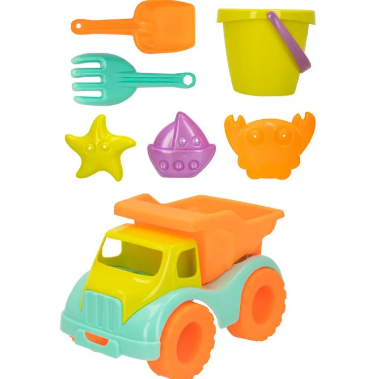 Camión para la playa acompañado de accesorios como un cubo, pala, rastrillo y 3 moldes para la arena. Recomendado a partir de 3 años.