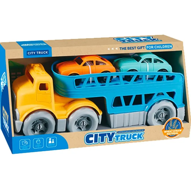 Colorido camión de transporte acompañado de 2 coches que podrás subir en su parte trasera y transportar.