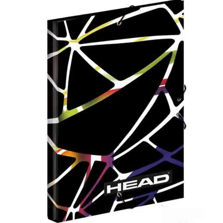 Carpeta de gomas de color negro con dibujos que parecen telarañas de colores.