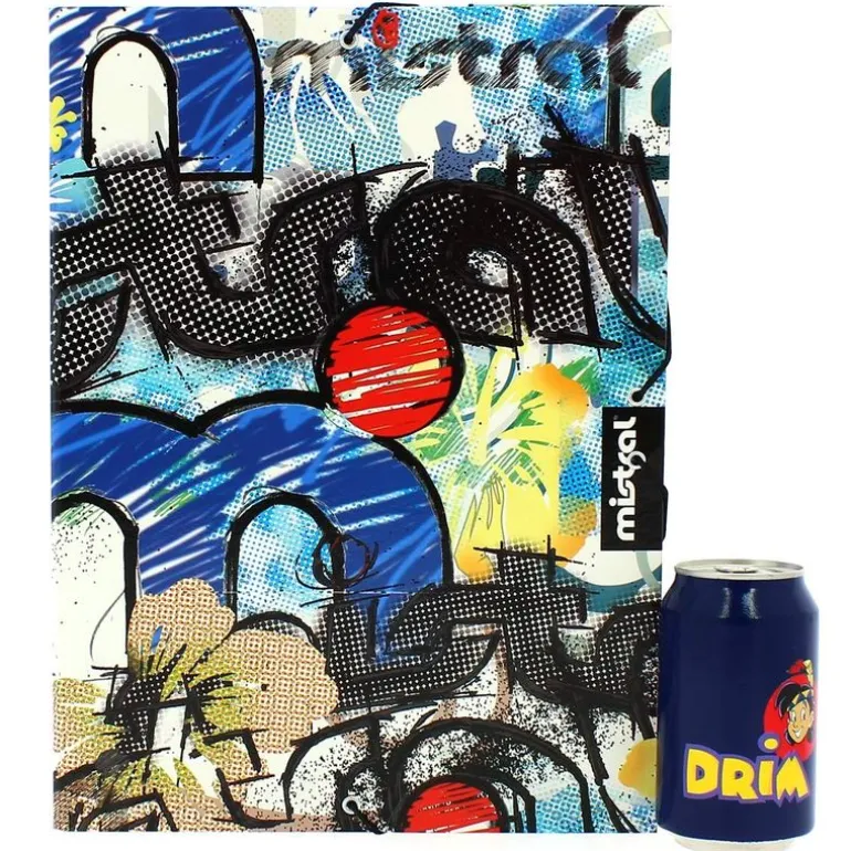 Carpeta escolar con diseño urbano e ilustraciones de grafiti. Dispone de solapas y cierre de gomas elásticas. Su tamaño es de A4.