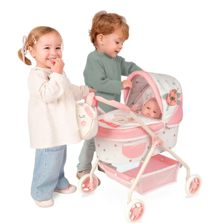 i primer carro de muñecas Coco de DeCuevas. Con bandeja inferior de tela portaobjetos, ruedas con cubierta de foam silencioso, manillar acolchado, capazo rígido, capota extensible y bolso para el carro a juego. El carro tiene unas dimensiones de 56 cm de alto x 35 cm de ancho x 50 cm de largo. Las dimensiones del capazo son de 41 cm de largo x 24 cm de ancho. Ideal para muñecas bebés de hasta 42 cm de largo NO incluida. *Nota: para ver si el carrito puede venirle bien en altura, mida desde el suelo hasta el codo de la niña y comparelo con la altura del manillar. Recomendado a partir de 3 años