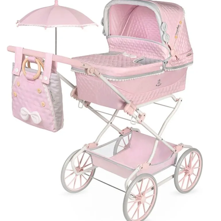 Carrito de muñecas de la línea Sophie de color rosa con detalles blancos y grises, estructura plegable, manillar con altura ajustable, suspensión, lazos acolchados, detalles bordados, botones decorativos en madera natural, bolso a juego con asas de madera natural, sombrilla, grandes ruedas con cubierta de foam, tela acolchada, bandeja porta objetos, capota con tensores, colchón, mantita, cubre con pequeño bolsillo y muchos más detalles.