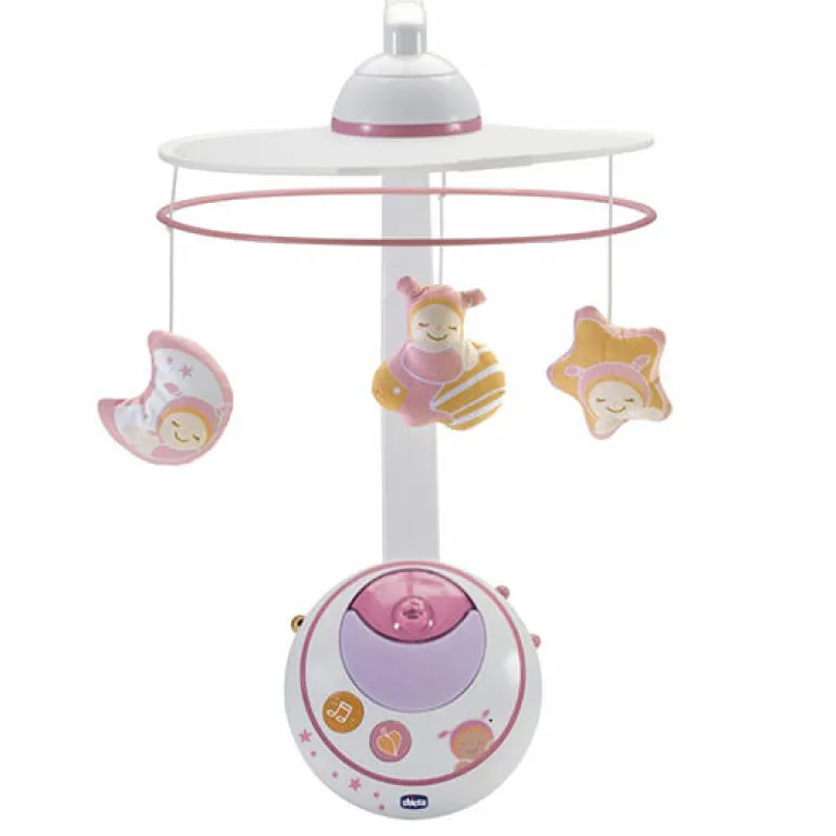 Carrusel con sistema de doble proyección, que proyecta imágenes de estrellas y planetas de colores por la habitación, creando una atmósfera mágica.
