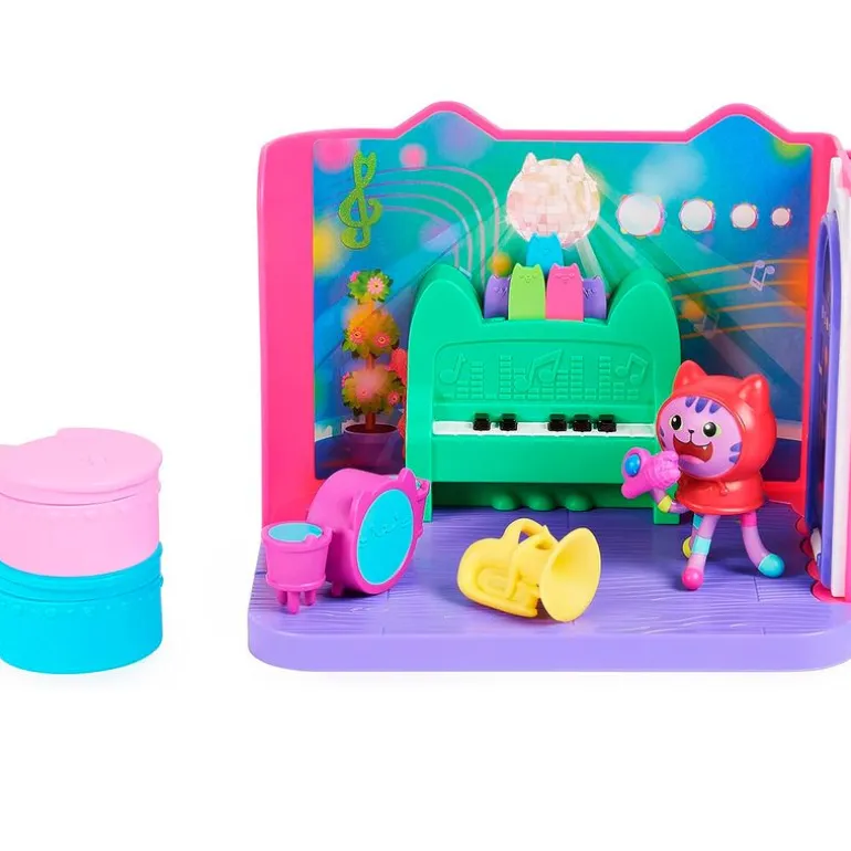 Sala de música de la serie de animación la Casa de Muñecas de Gabby. Contiene una batería, un piano con gatitos que bailan cuando pulsas las teclas y una gramola que se transforma en escenario de karaoke cuando lo doblas. Abre las cajas sorpresa para encontrar dos accesorios de música sorpresa. Contiene la figura de DJ Capucha. Recomendado a partir de 3 años.