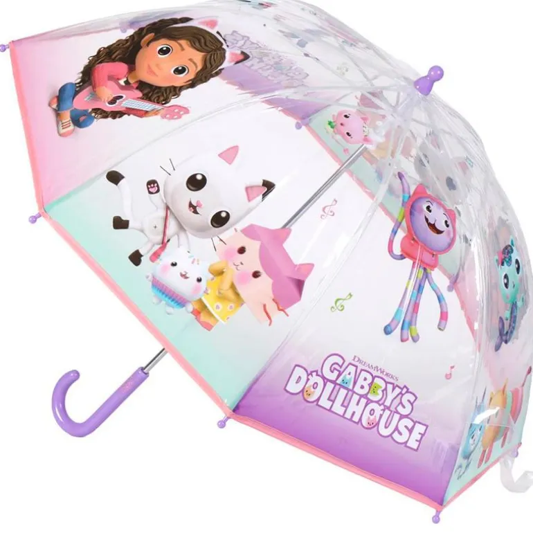 Paraguas manual con diseños inspirados en la serie de animación la Casa de Muñecas de Gabby. Mide 71 cm de diámetro.