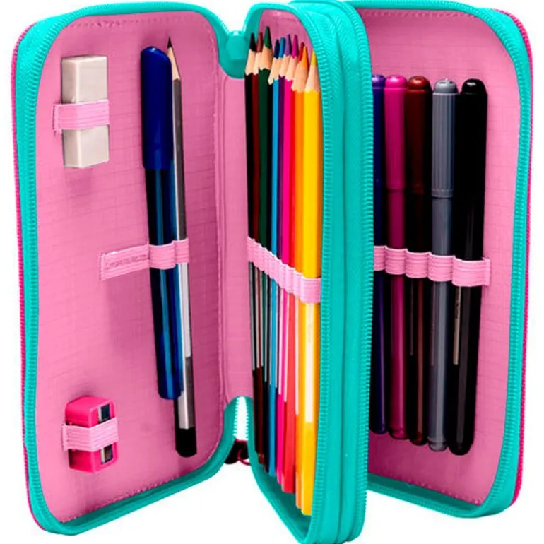 Estuche doble con diseños inspirados en la serie de animación la Casa de Muñecas de Gabby. En el interior encontrarás colores, rotuladores, un bolígrafo, un lápiz, una goma y un sacapuntas. Sus dimensiones son de 20 cm x 12 cm x 4 cm aproximadamente.