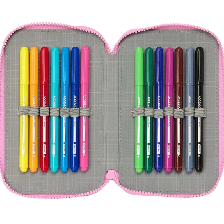 Estuche doble con diseños inspirados en la serie de animación la Casa de Muñecas de Gabby. En el interior encontrarás goma, sacapuntas, lápiz, bolígrafo, lápices de colores y rotuladores. Sus dimensiones son de 19.5 cm x 12.5 cm x 4 cm aproximadamente.
