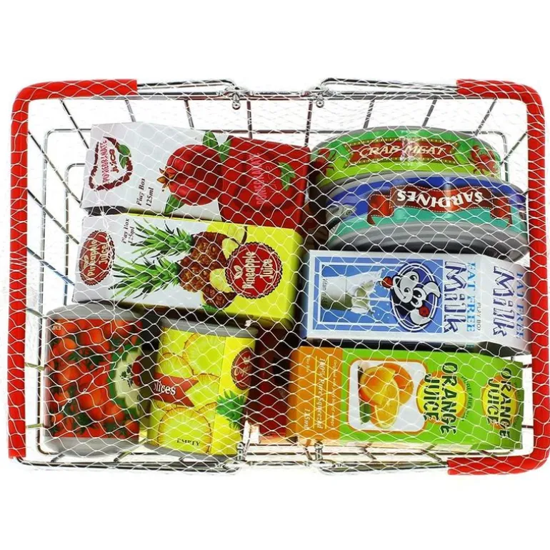 Con este cesto podrás hacer tu compra más cómodamente y guardar dentro de él todo lo que necesites. Reproduce divertidas historias en el supermercado y disfruta recreando el juego de ir a hacer la compra. El cesto incluye varios alimentos de imitación que harán más real y divertido el juego. El cesto es metálico y las asas de plástico. Contiene varios productos de imitación como: zumos, leche, latas envasadas, caja de galletas, caja de cereales, caja de café… Medidas aproximadas del cesto: 10 x 23 x 17 cm.