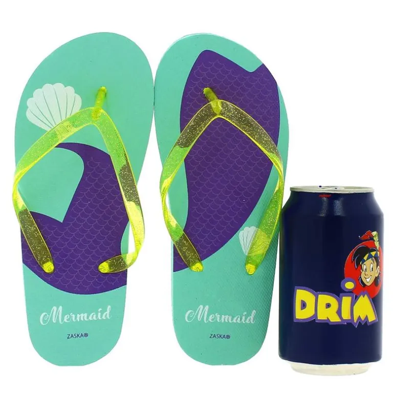 Originales chanclas inspiradas en el mágico mundo de las sirenas y el fondo del mar. Sus tiras son amarillas y tienen un bonito diseño, con fondo turquesa y la imagen de una cola lila. Talla 32.
