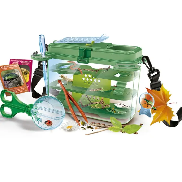 Contiene una casa de insectos para montar, un instrumento atrapa-insectos para montar, una correa con mosquetones, una pinza, una pipeta, un vasito con tapa, una lupa, tarjetas didácticas y un manual ilustrado.