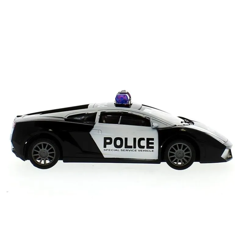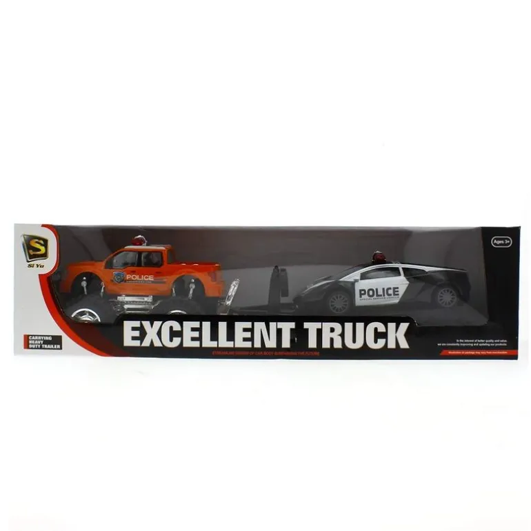 Conjunto compuesto por un vehículo 4 x 4 pick up con remolque y coche de policía. El todoterreno mide, aproximadamente, 11 x 24 cm, el coche de policía 24 cm y el remolque 34 cm.
