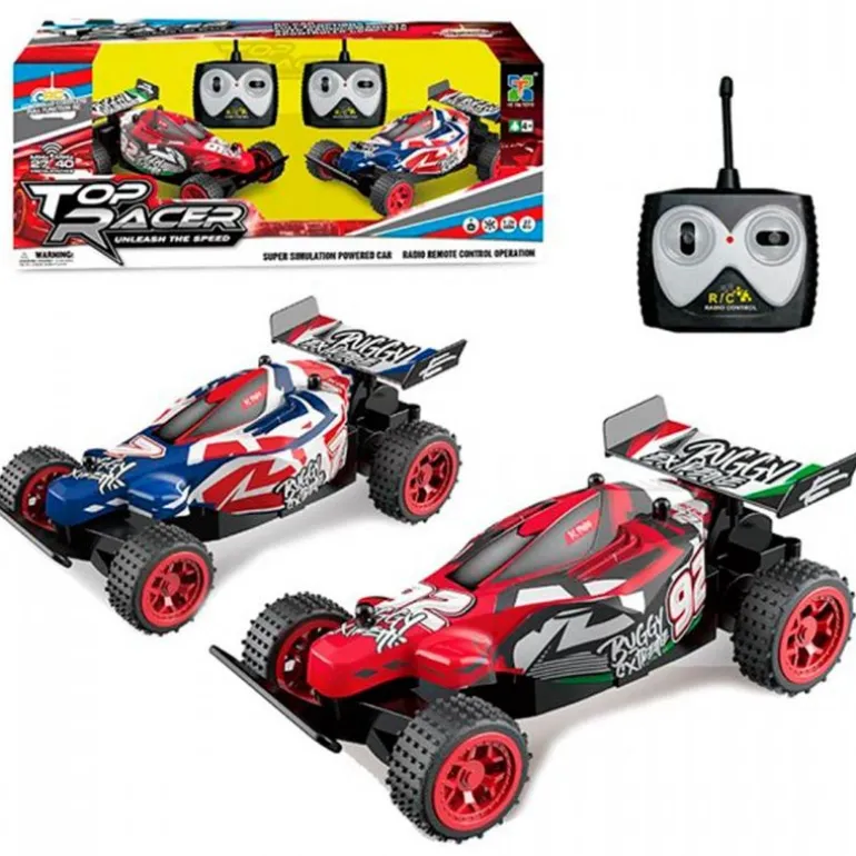 Pack de dos coches buggy teledirigidos a escala 1:28, con frecuencia de 27 y 40 MHz. La carrocería es de plástico resistente. Equipado con neumáticos de goma. El manejo es fácil, gracias a sus funciones completas de movimiento (delante, atrás, izquierda y derecha).