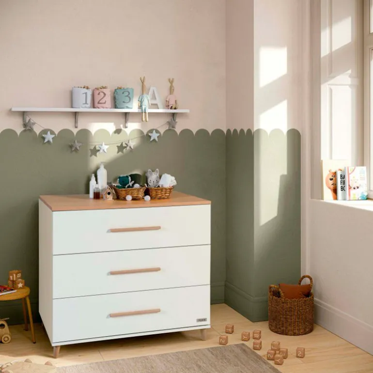 La Comoda Co-1972, destaca por su nuevo diseño que combina el blanco con la madera, de gran capacidad de almacenaje para tener toda la ropita de tu bebe bien organizada.