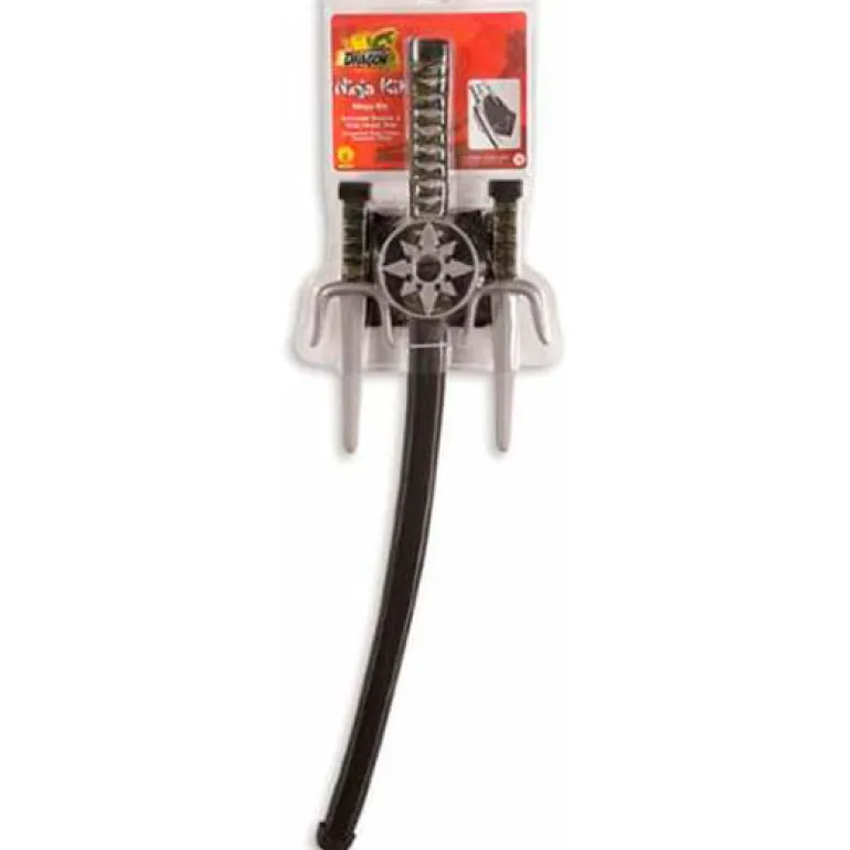 Completa tu disfraz de Ninja del Dragón con este conjunto de armas que incluye una espada, dos dagas, capucha y estrellas ninja.