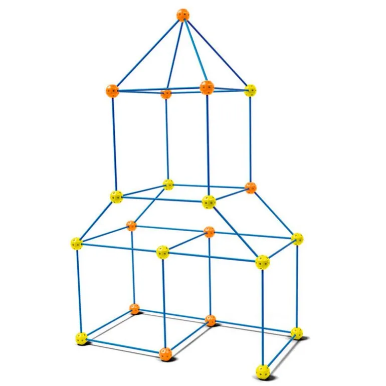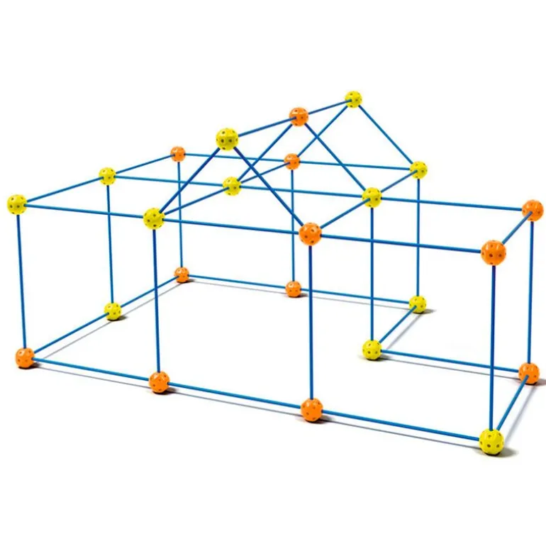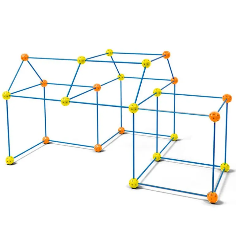 Tienda de campaña para los más pequeños de la casa, con la que podrán montar diferentes estructuras con las varillas y piezas de conexión resistentes. Incluye 24 piezas de conexión ( naranjas y amarillas), 6 varillas cortas y 40 varillas largas, en tono azul. No incluye la lona.