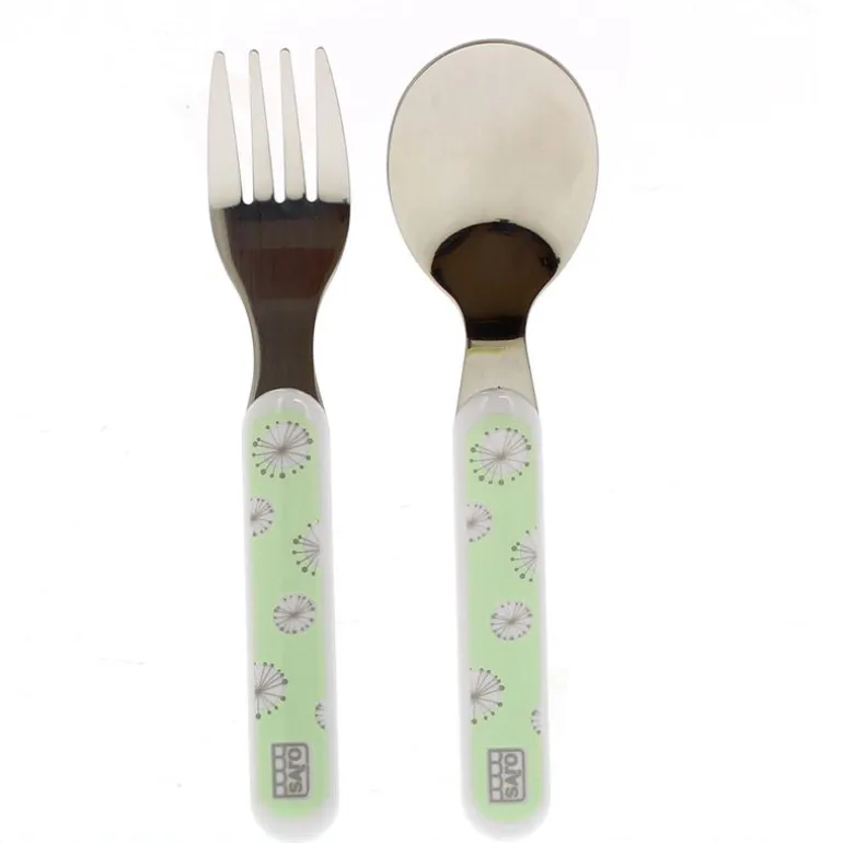 Pack de cubiertos de acero inoxidable formado por: 1 cuchara y 1 tenedor. Con colores llamativos y mangos antideslizantes para que tu hijo pueda aprender a comer sólo de forma fácil y segura gracias a sus acabados redondeados.