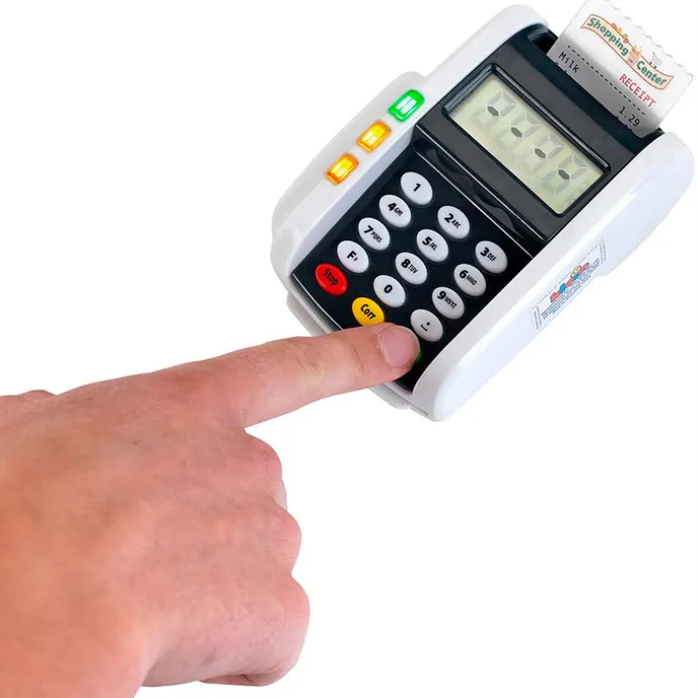 Datafono – terminal de pago ideal para que puedas completar tu supermercado infantil de la manera más moderna. Dispone de función de luz y sonido. Dispone de función de pago sin contacto “Contactless” y una ranura para tarjetas de crédito con sonido. Viene acompañado de 3 tickets de recibo y una tarjeta de crédito con función de pago sin contacto. Funciona con 2 pilas AAA NO incluidas. Recomendado a partir de 3 años.