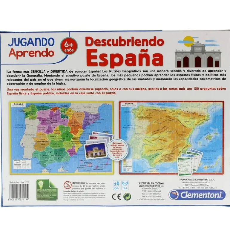 Puzzle educativo a doble cara de España física y España política de 104 piezas. Además de un puzzle es tambien un juego con 150 preguntas sobre España con las imágenes de los monumentos más importantes. Edad recomendada a partir d 6 años.