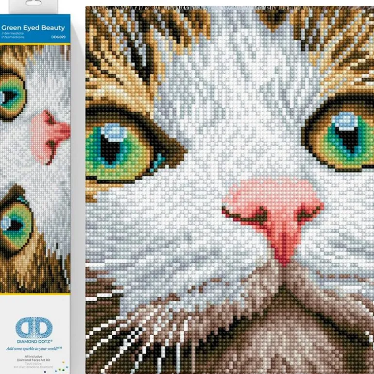 Pack de Diamond Painting con el que podrás crear un precioso gato de ojos verdes. Contiene diamantes preclasificados, una bandeja de manualidades, un lápiz óptico y un organizador de cera. Sus dimensiones son de 35 cm x 27 cm aproximadamente. Recomendado a partir de 3 años.