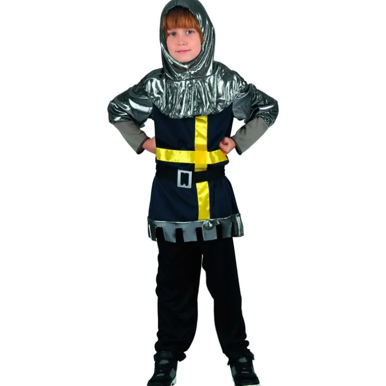 Disfraz de caballero medieval de niño, compuesto por pantalón, camisa, cinturón y capucha. No incluye zapatos. Talla M (Altura 120-130cm, pecho 67cm, cintura 60cm, 6-8 años) orientación aproximada.