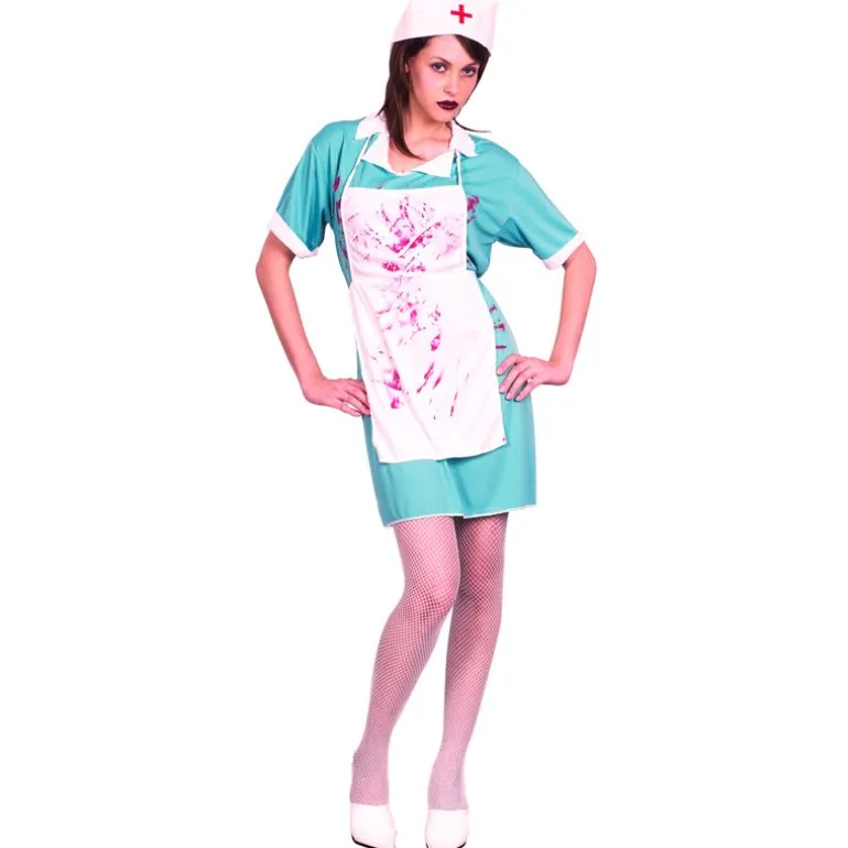 Disfraz de enfermera malvada compuesto de vestido, delantal ensangrentado y gorro. NO incluye medias y zapatos. Talla 38 (Altura 168cm, pecho 91cm, cintura 76cm, Talla S) orientación aproximada.