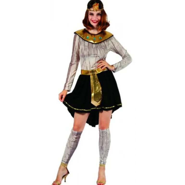 Disfraz de momia compuesto por un vestido de falda negra siendo la parte trasera más larga que la delantera la parte de arriba del vestido da la sensación de que sean vendas como las de la momia, lleva collar dorado con 3 perlas, corona y polainas que va del tobillo hasta la rodilla aproximadamente, NO incluye zapatos.