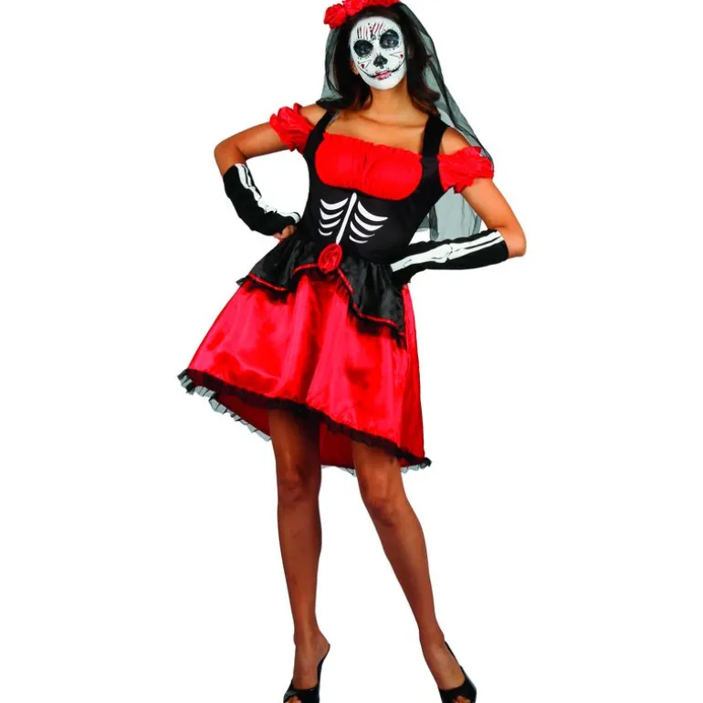 Disfraz de la muerte de gala, compuesto por vestido, accesorio cabeza y manguitos. Zapatos no incluidos. Talla 38 (Altura 168cm, pecho 91cm, cintura 76cm, Talla S) orientación aproximada.