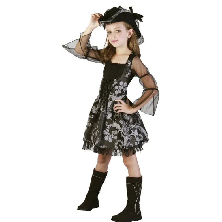 ¡Al abordaje! Disfraz de pirata infantil compuesto por un vestido. Es de color negro y tiene un bonito estampado floral. Incluye mangas de tul, enaguas y el característico sombrero de bucanero. NO incluye calzado. Talla M (Talla 6-8 años) Altura 120-130cm, pecho 67cm, cintura 60cm, orientación aproximada.