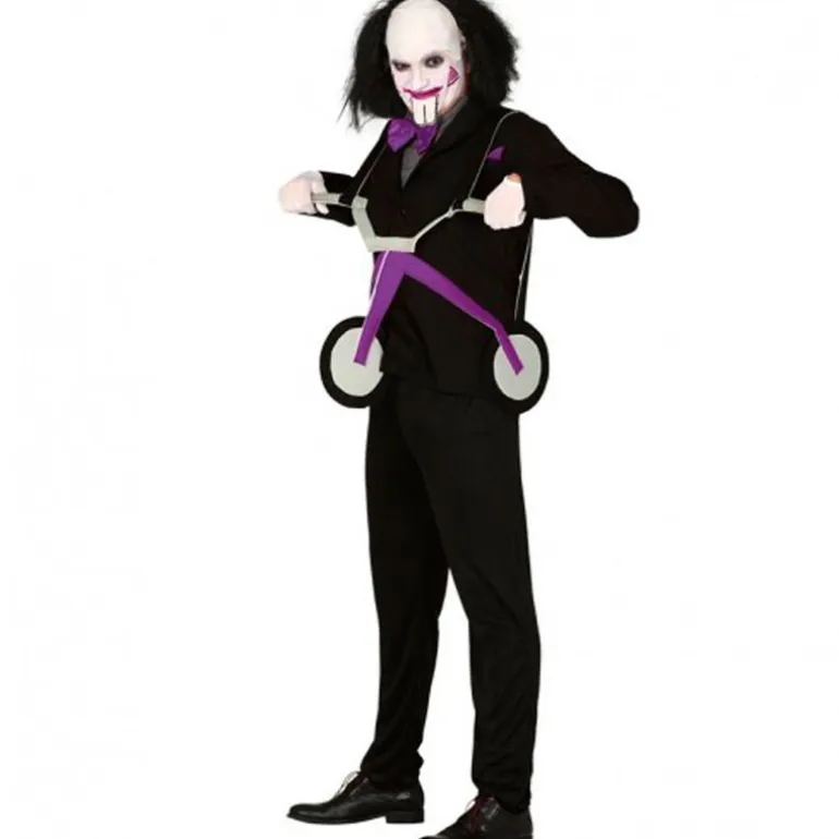 Disfraz de triciclo asesino, inspirado en el personaje Jigsaw, de las terroríficas películas de Saw.