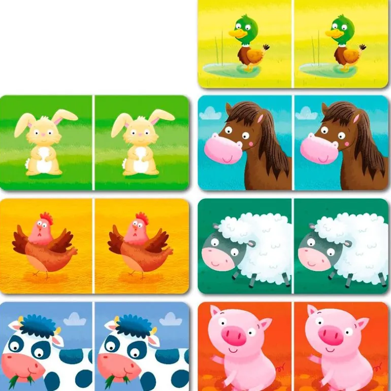 Dominó para los más pequeños con temática de la granja. Contiene 28 piezas, fabricadas en cartón, con un tamaño de 14 cm x 7 cm aproximadamente. Recomendado a partir de 3 años.