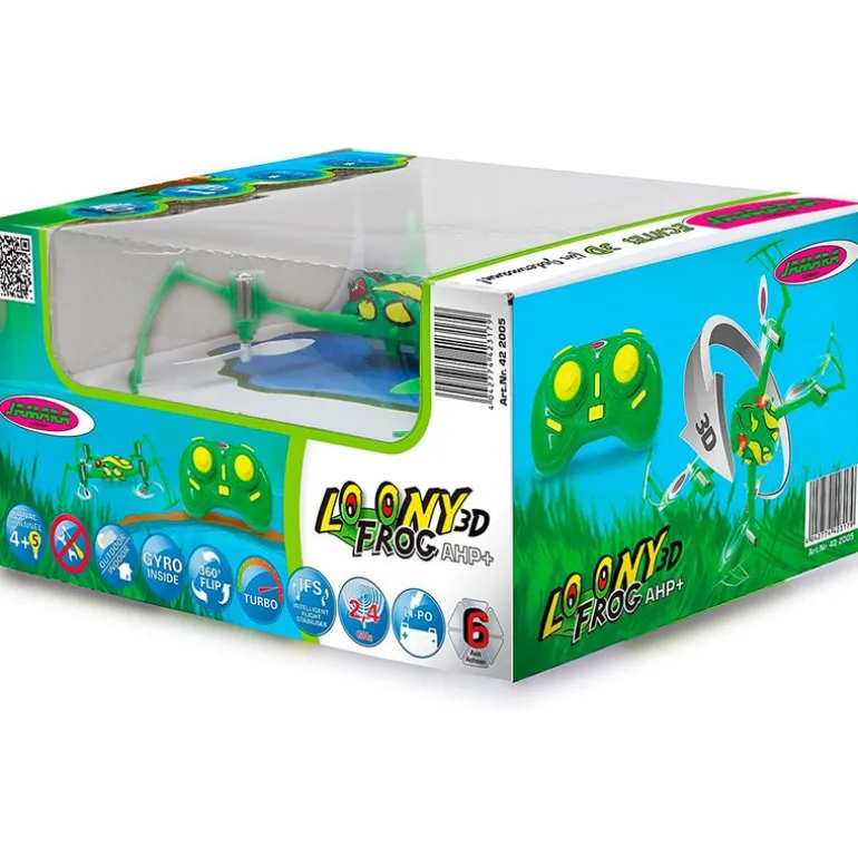 Drone en forma de rana con vuelo invertido. Función de brújula (flyback) que podrás conectar o desconectar, salto de 360 grados en todas las direcciones, control de vuelo de 6 ejes autoestabilizador, chasis resistente de plástico ligero, 4 motores potentes, velocidad de hasta 40 km/h. Con tres métodos de vuelo para principiantes. Función turbo y cambio rápido de batería. Contiene batería, mando radiocontrol, cable de carga USB, hélices de repuesto e instrucciones. El mando funciona con 4 pilas AA NO incluidas. Recomendado a partir de 6 años.