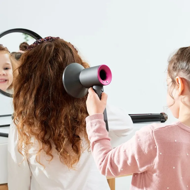 Pack con el que las más pequeñas de la casa podrás divertirse mientras crean sus propios peinados. En el interior encontrarás accesorios inspirados en la famosa marca Dyson. Conteine un secador Supersonic que expele aire y reproduce sonidos y luces como si fuera de verdad, un accesorio boquilla, accesorio difusor, cepillo de barril y peine desenredante. Funciona con 3 pilas AAA NO incluidas. Recomendado a partir de 3 años.